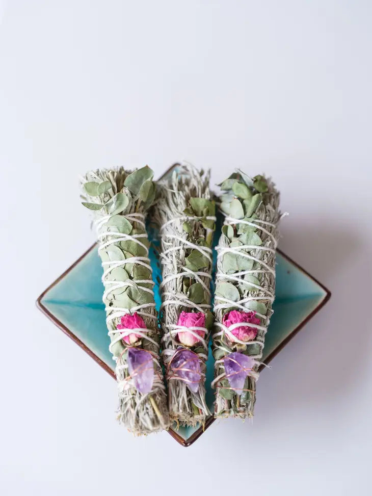 These gorgeous smudge sticks are made from desert sage, also called mountain sage, which I ethically harvested in Utah. They are blended with eucalyptus, tied with organic cotton thread, and include a dried rose and an amethyst crystal.