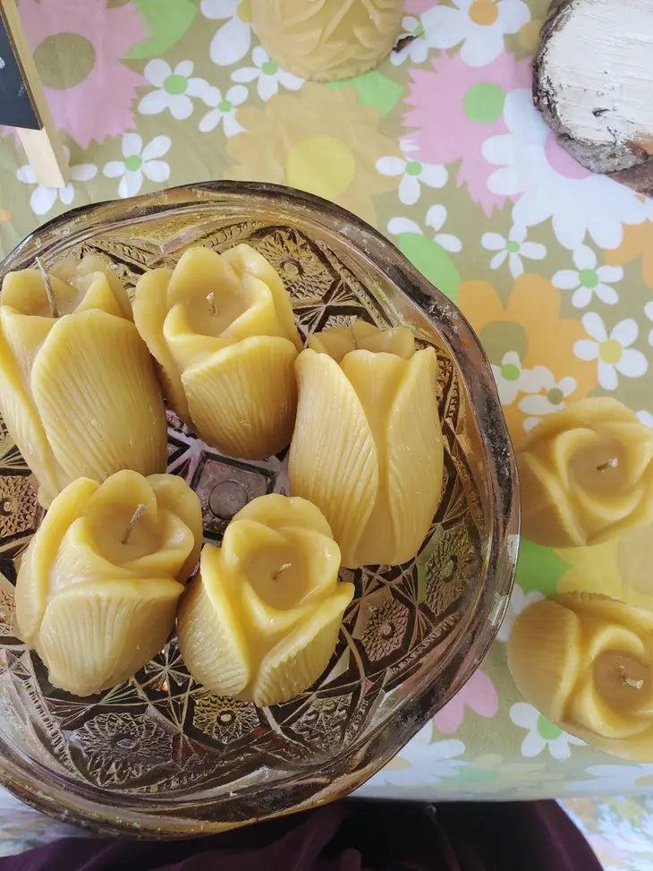 One beeswax candle shaped like a tulip, measuring 2 .7/8" high and 1. 5/8" at the base. Made of pure beeswax and cotton wick.