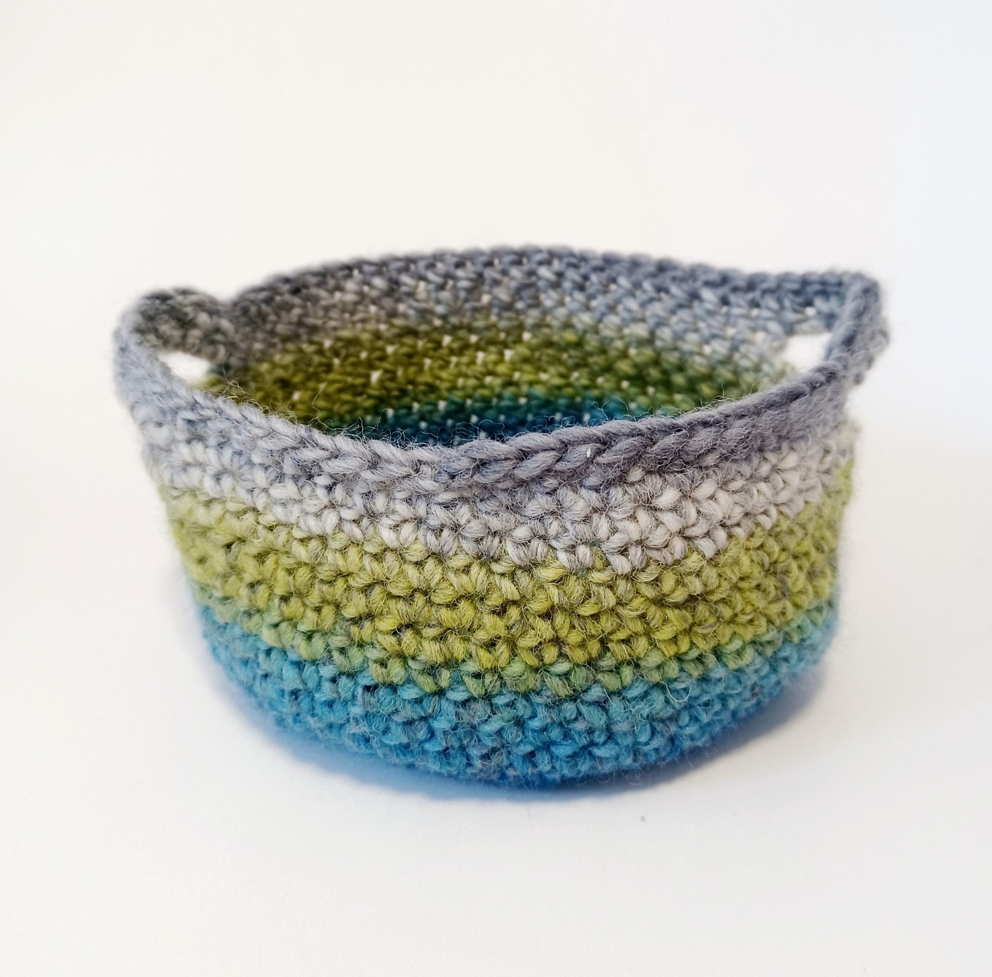 We used a premium natural fiber yarn in shades of grays, greens & blues to craft this soft basket. Perfect for decorative use, gifting, or organizing small items.